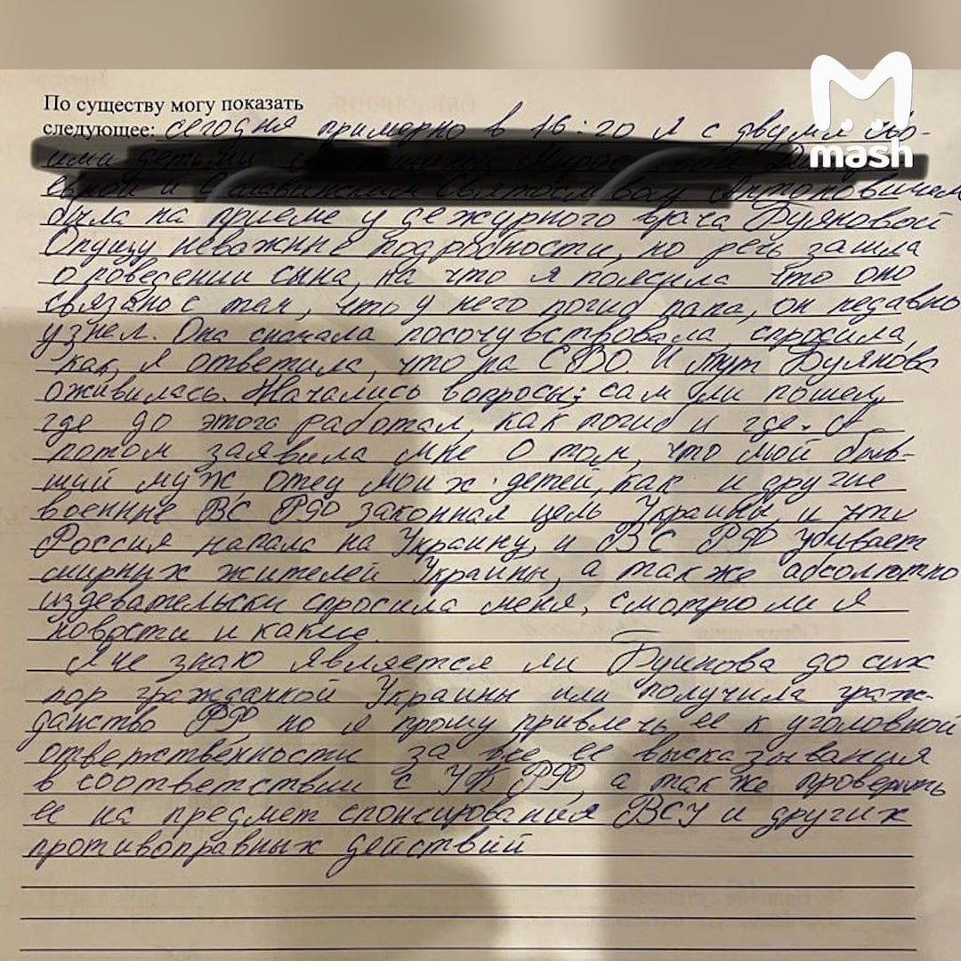 Москвичка обратилась в правоохранительные органы с просьбой привлечь врача к ответственности и проверить её на предмет финансирования ВСУ. Она сказала, что терапевт в 2014 году окончила Львовский медицинский университет, и вероятно, до сих пор является гражданской Украины. Вдова добавила, что обратилась к главврачу поликлиники, но инцидент там попытались замять.
