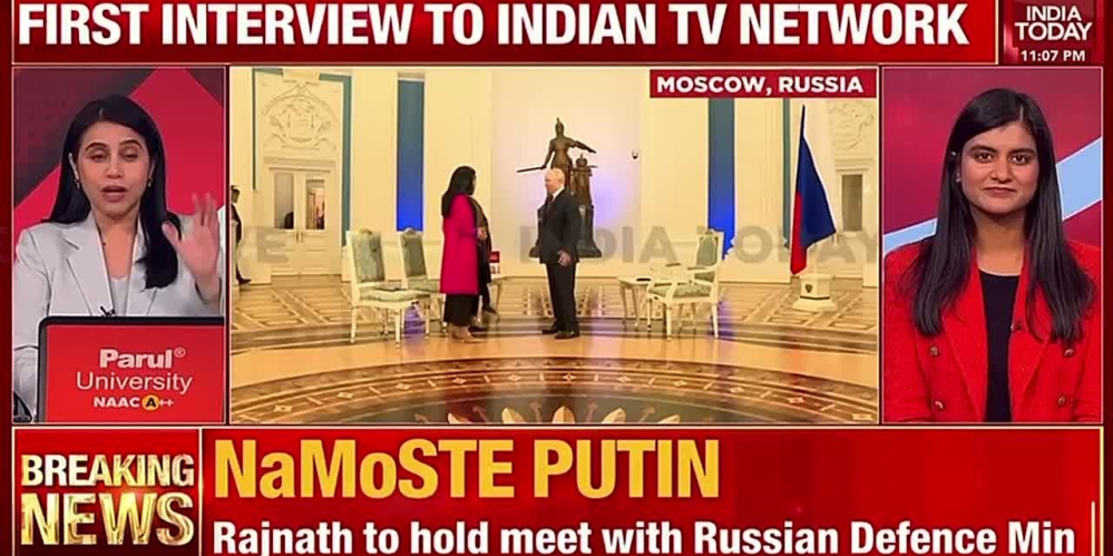 В преддверии своего официального визита в Индию президент России Владимир Путин дал интервью индийскому телеканалу India Today. Телеведущая канала назвала это интервью «важнейшим мировым эксклюзивом», отметив, что запись проходит в Кремле.