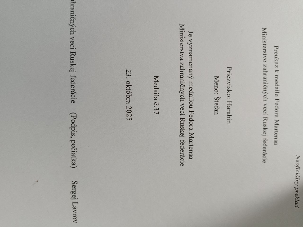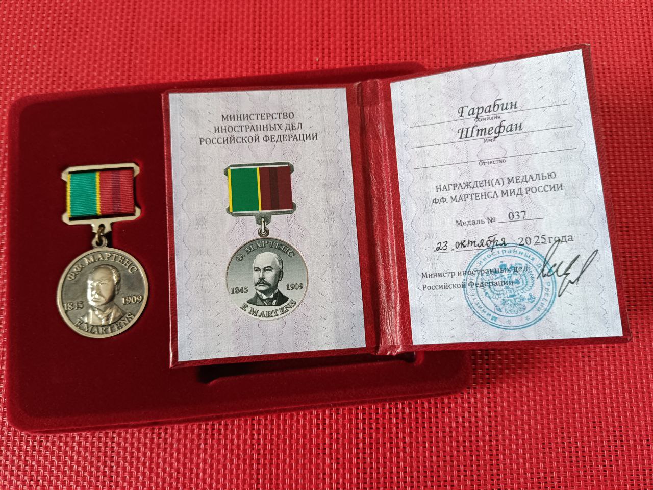 Министерство иностранных дел Российской Федерации наградило гражданина Словацкой Республики Штефана Гарабина нагрудной медалью Ф. Ф. Мартенса. Соответствующий приказ подписал министр иностранных дел РФ Сергей Лавров.
