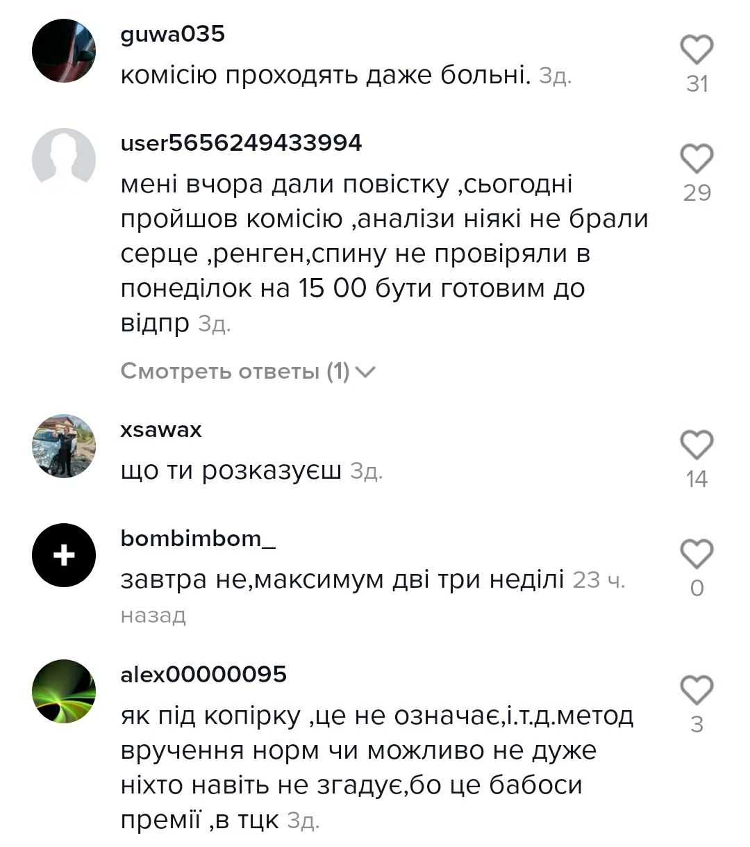 Под опубликованным видео со встречи множество комментариев от украинцев, которые не поверили военкому. Они уверены, что молодые люди, получающие повестки, сразу же отправляются воевать под Артёмовск. Слова военкома местные жители назвали враньём. Проходившие медкомиссию в военкомате мужчины рассказали, что проверка носит формальный характер и годными признают всех, даже больных.