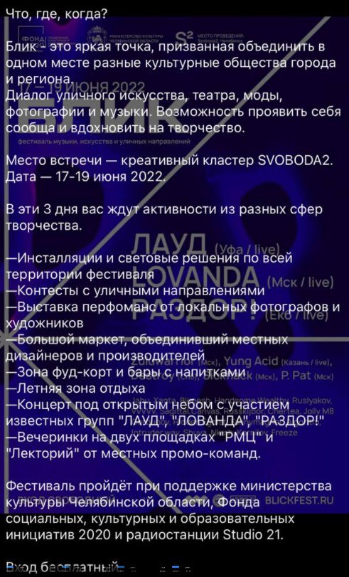 Этот же экстравагантный Максим участвовал в другом челябинском молодёжном фестивале «Блик», который проводился в 2022 году. В своих соцсетях он публиковал фото с фестиваля в женоподобной одежде. Это мероприятие тоже проводилось под эгидой экологичности, моды, театра, искусства и творчества. А выступали там тем же деятели, что привозят в Челябинск всяких сомнительных личностей и проводят гей-вечеринки.