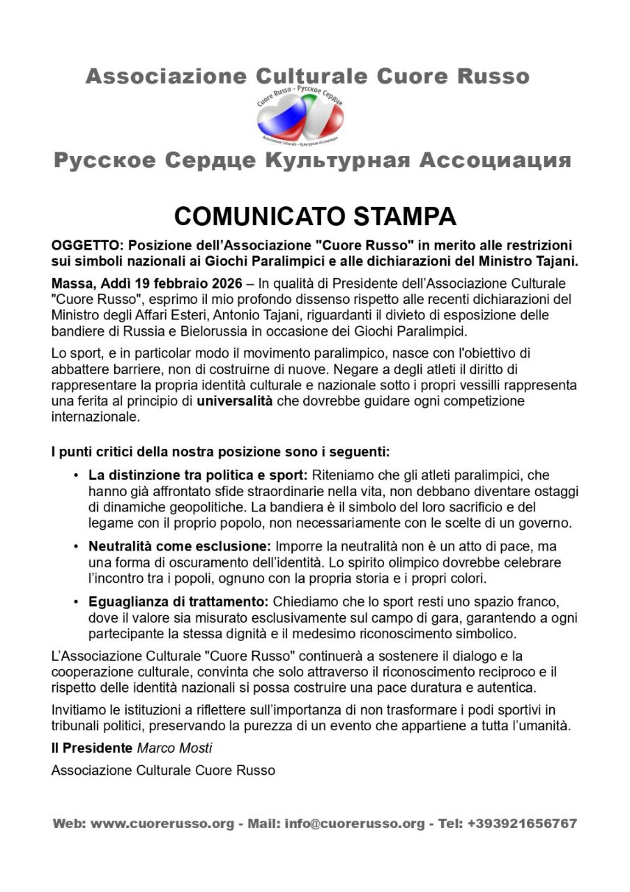 Президент культурной ассоциации «Cuore Russo» Марко Мости подготовил пресс-релиз в связи с заявлениями министра иностранных дел Италии Антонио Таяни об ограничении использования национальных флагов России и Беларуси на Паралимпийских играх.