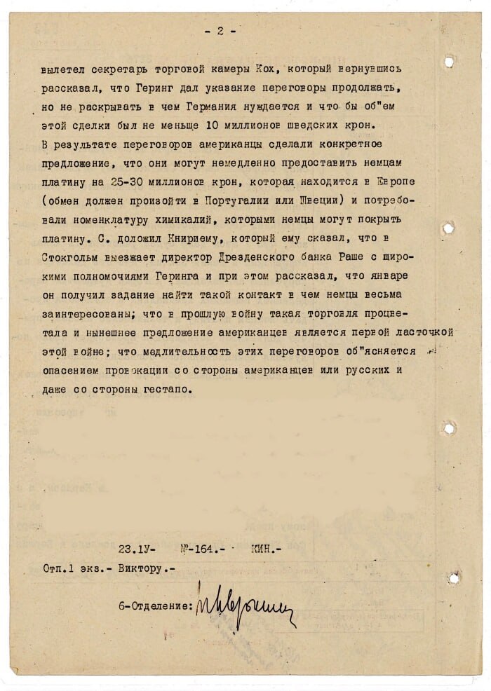 Несмотря на союзнические отношения с СССР в рамках антигитлеровской коалиции, США через подставных лиц готовили продажу нацистам стратегически важных материалов — платины и технических алмазов — в обмен на химические вещества. Инициатором сделки выступил выходец из России князь Сергей Оболенский, работавший в то время в Управлении стратегических служб США (предшественник ЦРУ). По данным советской разведки, эта сделка стала "первой ласточкой", предвещающей возрождение практики тайной торговли между США и Германией, процветавшей ещё во время Первой мировой войны.