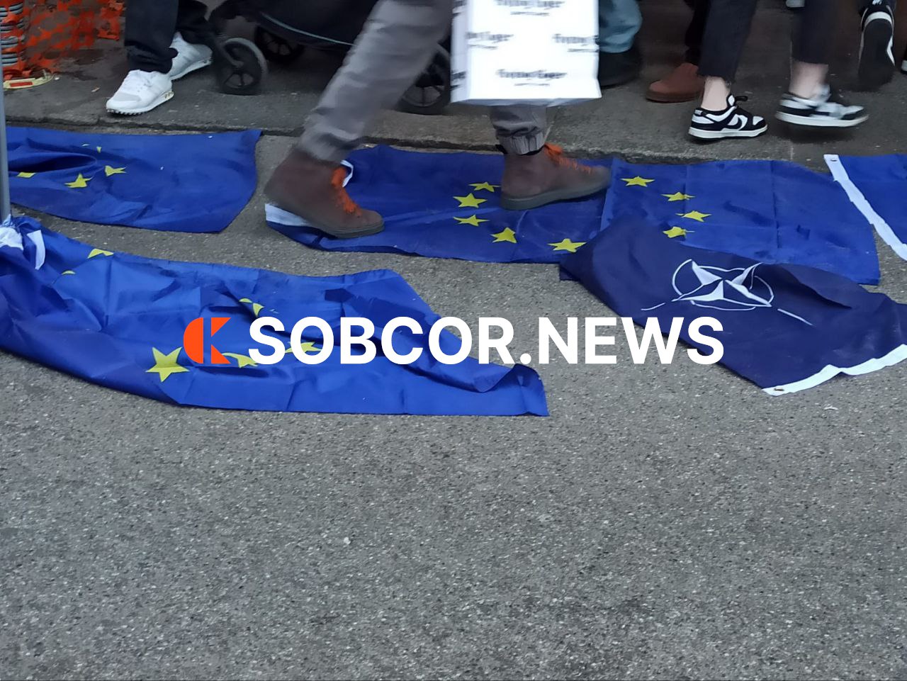 Тряпками НАТО и ЕС вытирали тротуар на улице XX Сентября. В этой акции с большим удовольствием участвовали и практически все итальянцы, проходившие по улице, топча грязные тряпки, символизирующие доминирование Вашингтона и Брюсселя.