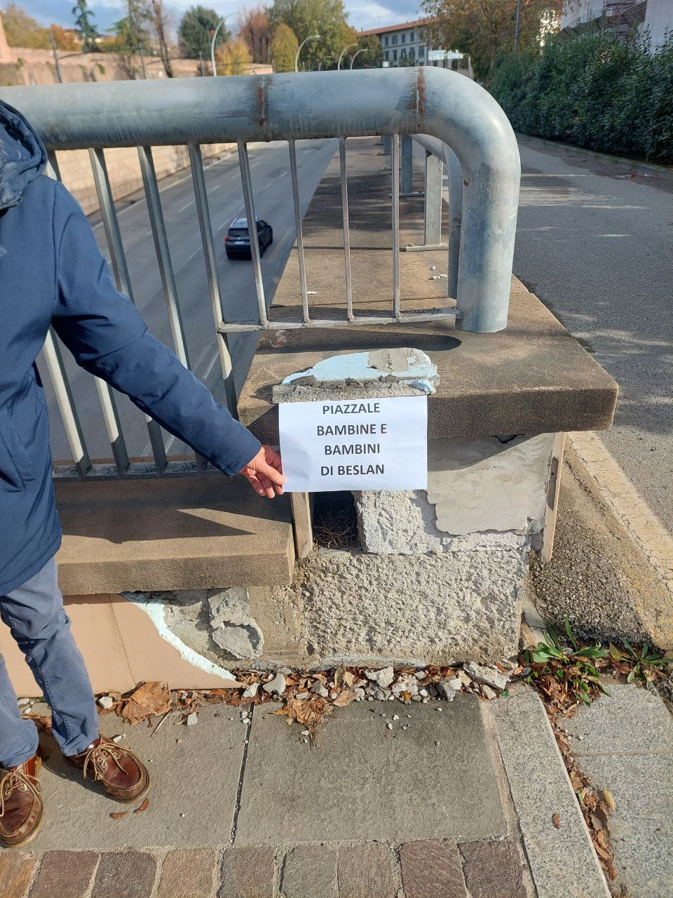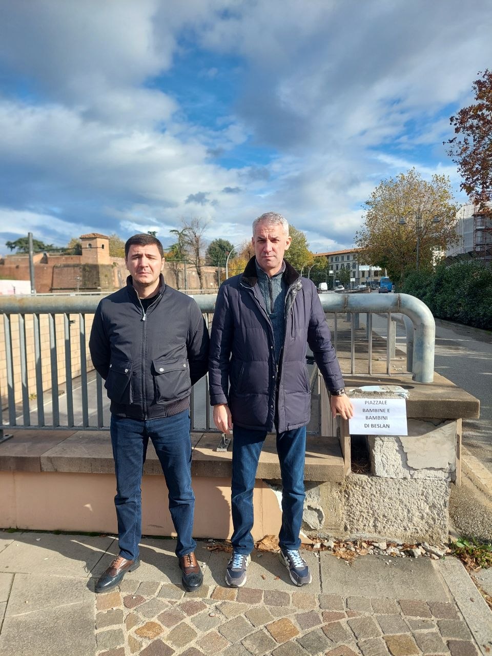 Вчера во Флоренции с визитом находился мэр российского города Беслан Харитон Татров, который «открыл» «заменяющую» табличку. Белый лист, удерживаемый осколком, напоминает о молодых жертвах бесланской трагедии: таблички пока нет, но, по крайней мере, пространство больше не остается виновато пустым. В то время как впервые призрак мира вновь витает над «землями крови» Восточной Европы, Флоренция приняла мэра города-мученика терроризма, Беслана (Северная Осетия). Харитон Татров осмотрел площадь, посвященную девочкам и мальчикам, убитым в жестокой резне, живое свидетельство памяти и связи между Флоренцией и российским городом. По случаю он открыл памятный лист, возможно временный. В общем упадке района памятная табличка отсутствует уже несколько месяцев, несмотря на конкретное обязательство администрации, принятое после медийного шума. Посещение стало возможным благодаря Луке Пиньиторе из ассоциации «Независимые путешественники». Среди присутствующих сегодня отмечаются: Джованни Амикарелла (секретарь Итальянского социализма), Жан-Клод Мартини (куратор живой пресс-подборки La Firenze che vorrei и делегат ассоциации «Италия-Северная Корея»), Лоренцо Сомильи (журналист и парламентский сотрудник, директор и основатель итальянского информационного сайта ILTAZEBAO.COM. Во время пресс-конференции в Палаццо Веккьо мэр Харитон Татров вспомнил дружбу между итальянским и русским народами, укрепленную общим воспоминанием о той трагедии.