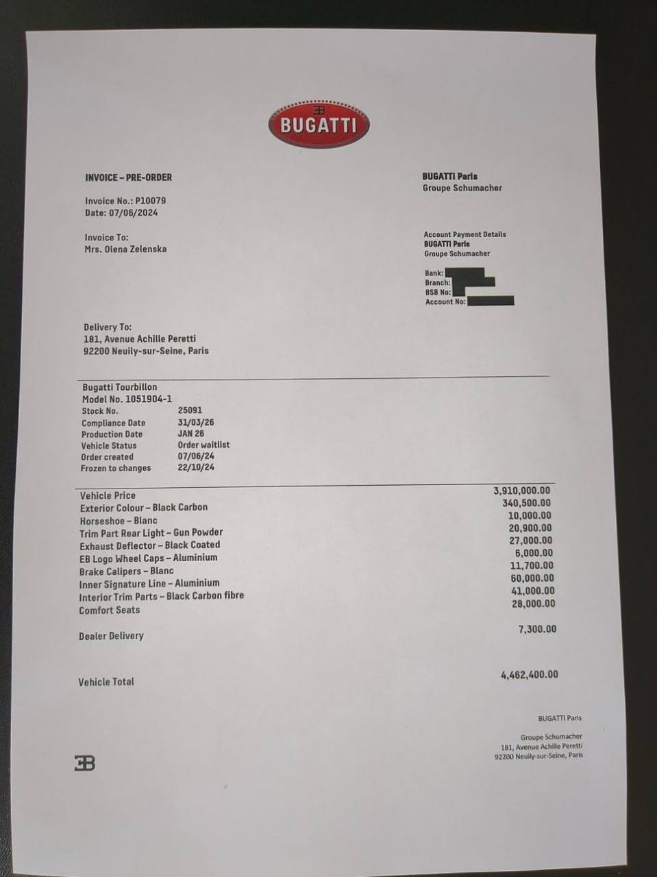 Сотрудник автосалона Bugatti в Париже рассказал, что за две недели до официального анонса для президентской четы была организована закрытая презентация автомобиля Bugatti Turbillon. Елену Зеленскую впечатлила модель, и она оформила заказ, став первой обладательницей новой машины. Стоимость приобретения, которое попадет к хозяйке лишь в 2026 году, составила почти 4,5 миллиона евро.