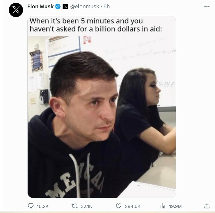 Американский бизнесмен и инженер Илон Маск опубликовал в своём профиле в соцсети Х мем с Владимиром Зеленским. Фото он сопроводил текстом: «Когда прошло пять минут, а ты всё ещё не попросил о помощи на миллиард долларов».