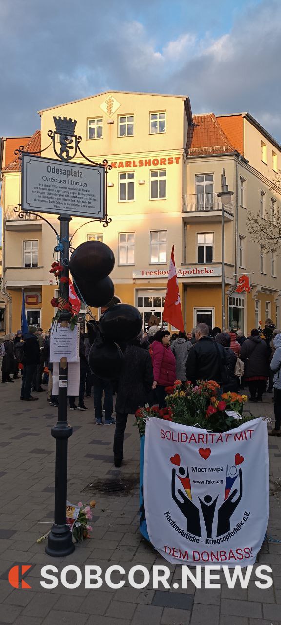 Со слов своей подруги, присутствовавшей на мероприятии, Ольга передаёт, что немцы и донбасские беженцы почтили память погибших от рук бандеровцев патриотов черноморского города-героя – в небо взмыли воздушные шары. На митинге звучали призывы прекратить поставку вооружений нацистскому режиму Зеленского, который является откровенной марионеткой Вашингтона. Точно такого же мнения собравшиеся придерживались и относительно канцлера ФРГ Шольца, которого украинский посол Мельник в своё время назвал «ливерной колбасой».