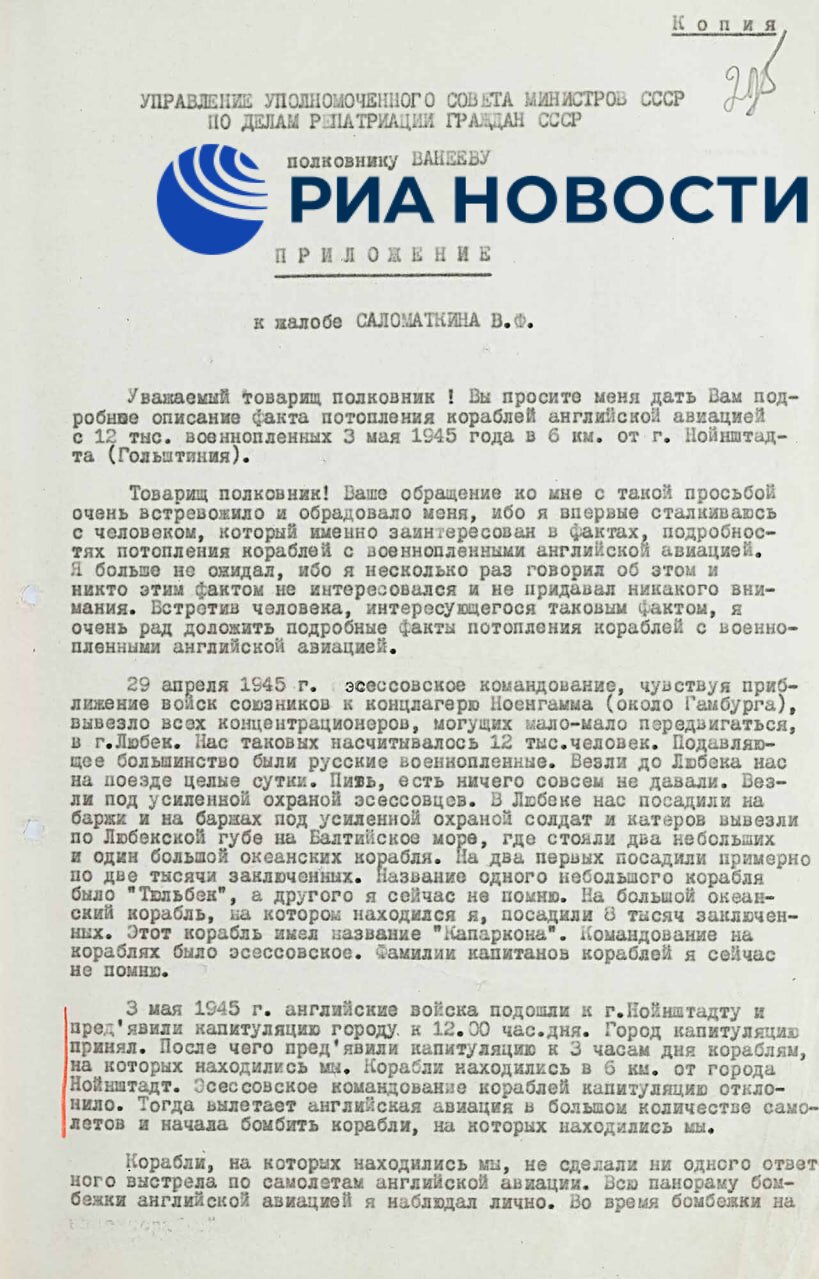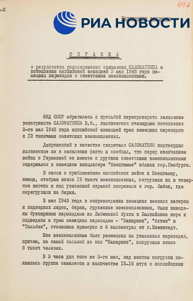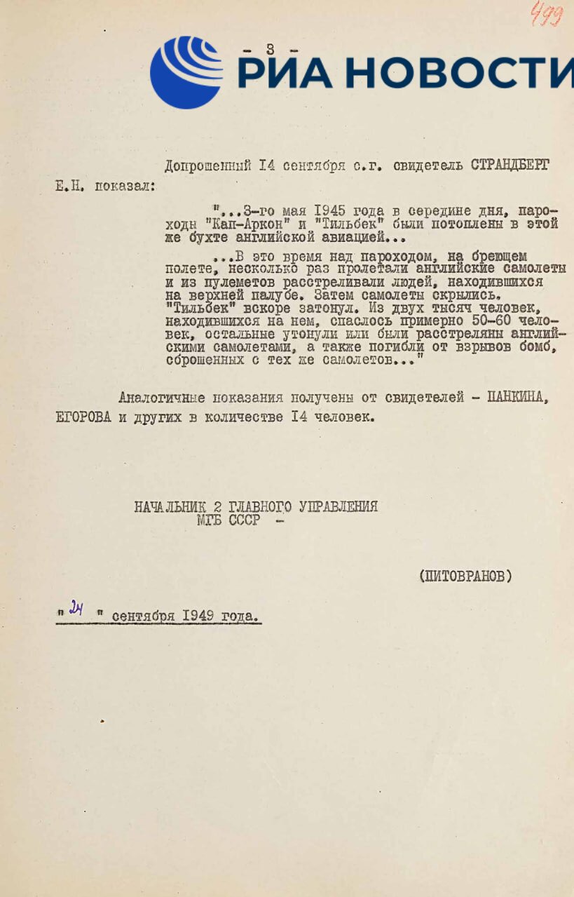 ФСБ России обнародовала архивные документы, касающиеся трагедии, произошедшей 3 мая 1945 года в Любекской бухте, когда британская авиация потопила три немецких судна ("Кап Аркона", "Тильбек" и "Дойчланд"), перевозивших узников нацистских концлагерей, в основном советских военнопленных.