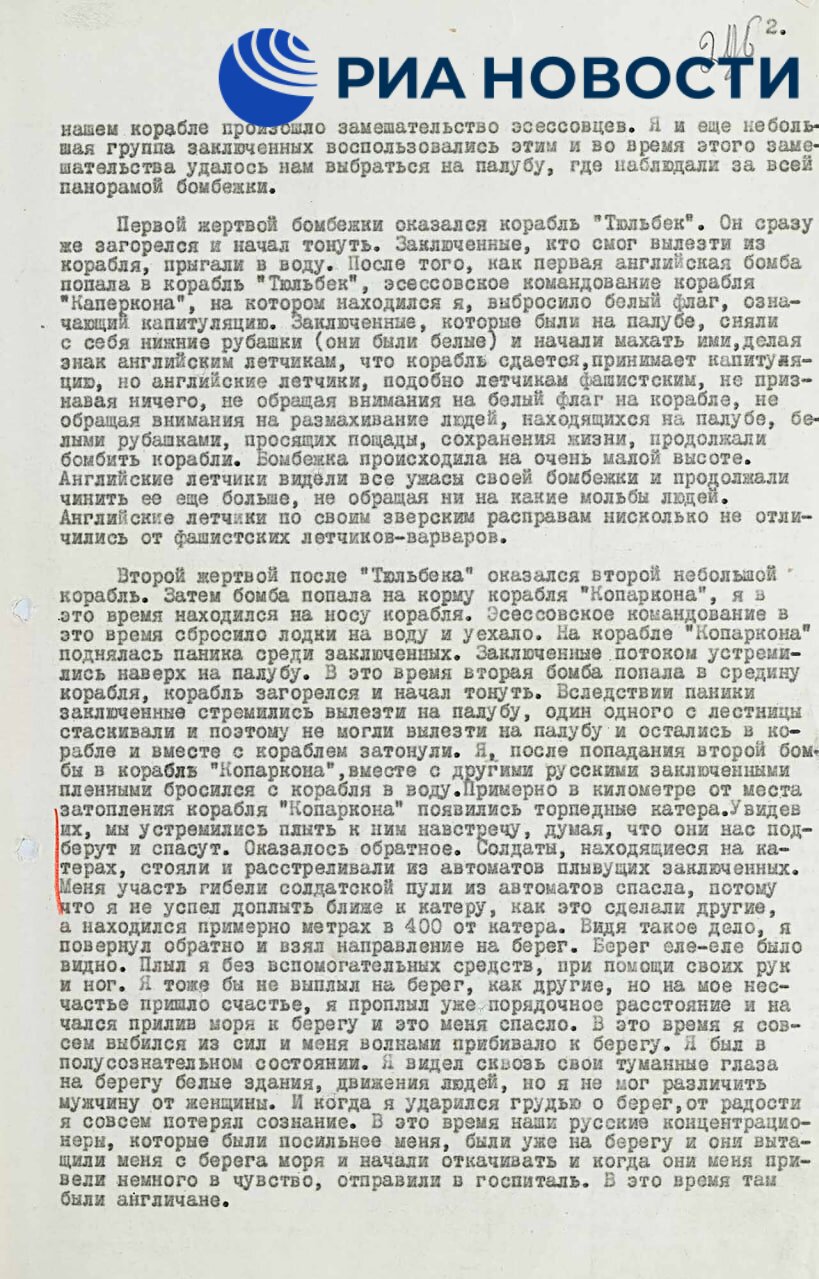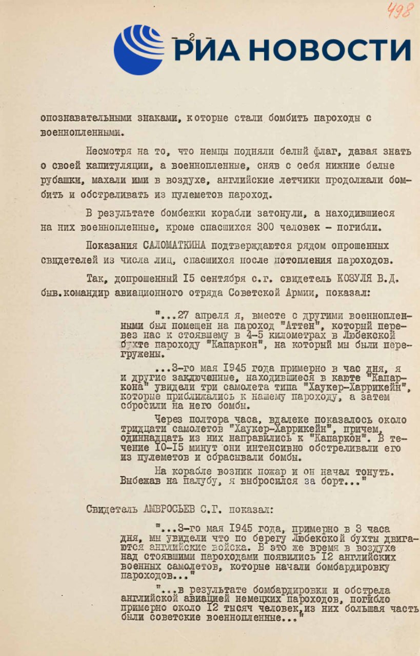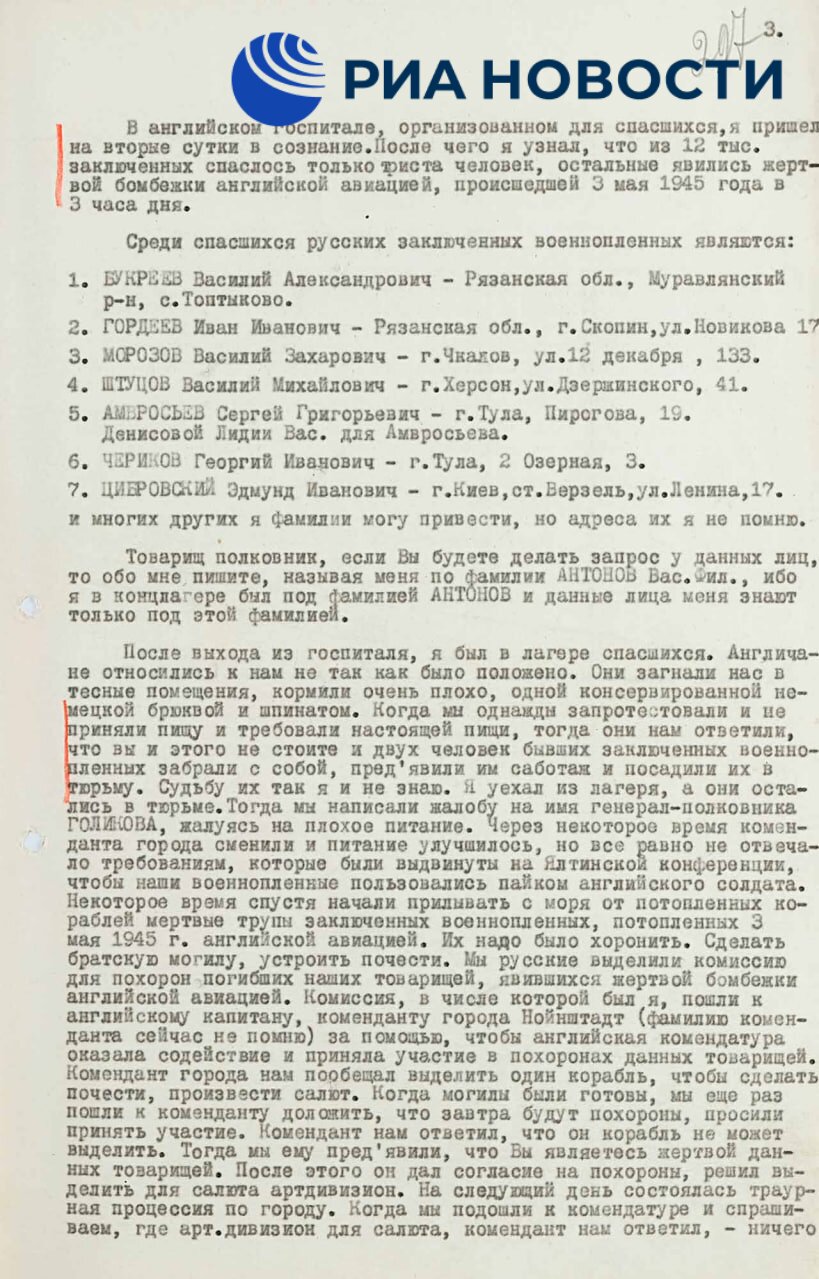 ФСБ России обнародовала архивные документы, касающиеся трагедии, произошедшей 3 мая 1945 года в Любекской бухте, когда британская авиация потопила три немецких судна ("Кап Аркона", "Тильбек" и "Дойчланд"), перевозивших узников нацистских концлагерей, в основном советских военнопленных.