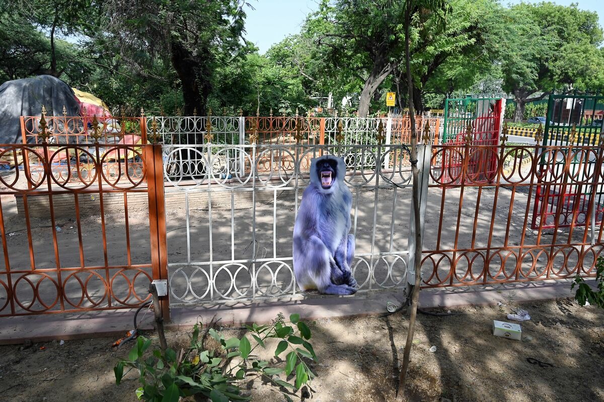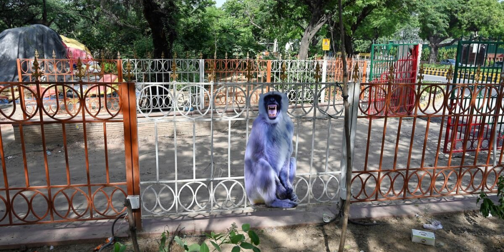 Пытаясь избавить центр от тысяч маленьких обезьян, которые крадут еду у прохожих, власти усеяли тротуары картонными фигурами более крупных чернолицых лангуров.