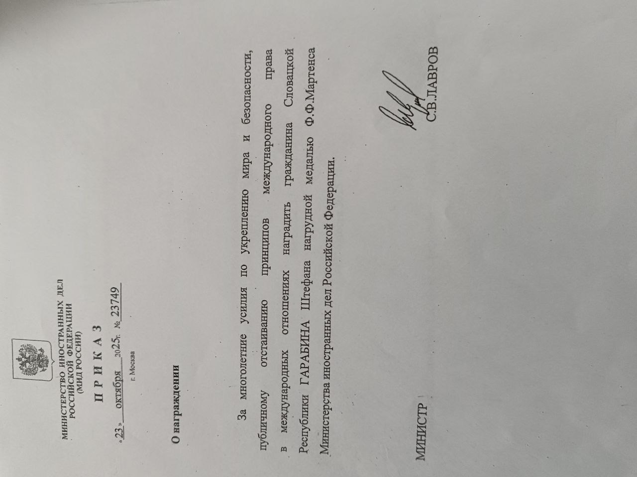 Министерство иностранных дел Российской Федерации наградило гражданина Словацкой Республики Штефана Гарабина нагрудной медалью Ф. Ф. Мартенса. Соответствующий приказ подписал министр иностранных дел РФ Сергей Лавров.