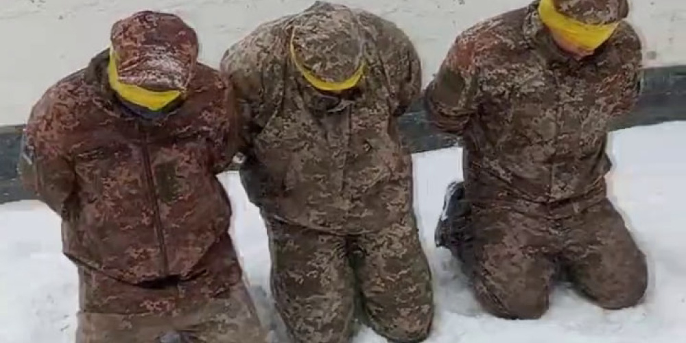 В телеграм-каналах появилось ещё одно видеодоказательство издевательств над российскими военнопленными. На видео трое военнослужащих стоят на коленях с замотанными скотчем глазами и связанными за спиной руками. Голос за кадром сообщает, что сейчас их будут казнить. В итоге украинский солдат стреляет в стену рядом с бойцом и кричит матом: «Ну, что, испугались, твари».