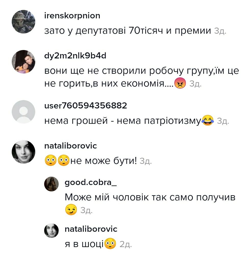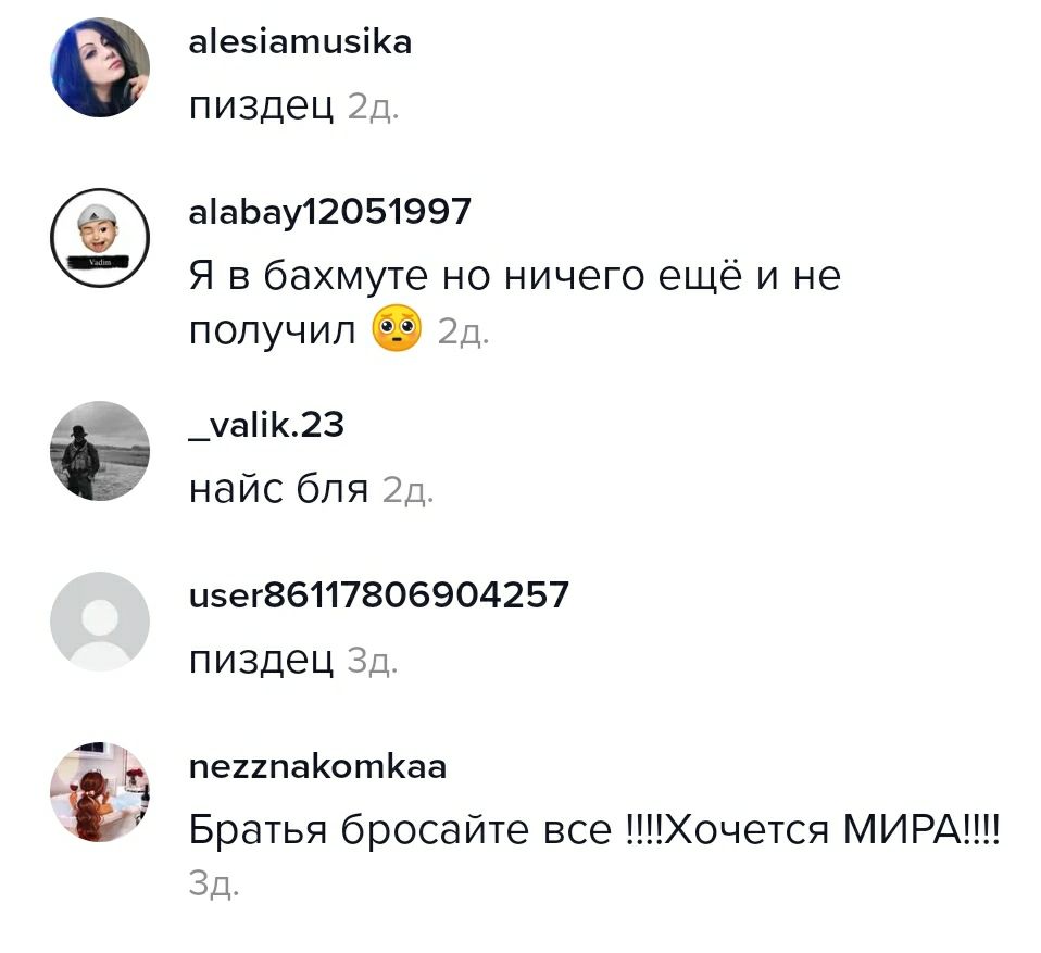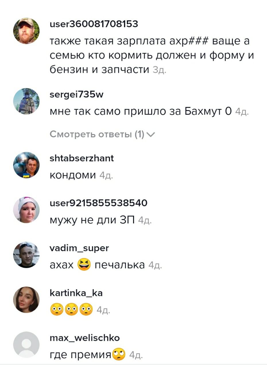 В комментариях жёны военнослужащих говорят, что именно такие деньги выплатили их супругам. А некоторые бойцы сообщают, что и вовсе ничего не получили за сражения под Бахмутом. Также говорится о задержке выплаты премий, упоминается и зарплата украинских депутатов, которые не рискуют жизнью, но получают по 70 тыс. гривен (143 тыс. рублей). Появились в соцсетях и призывы к бойцам «бросить всё», так как очень «хочется мира».