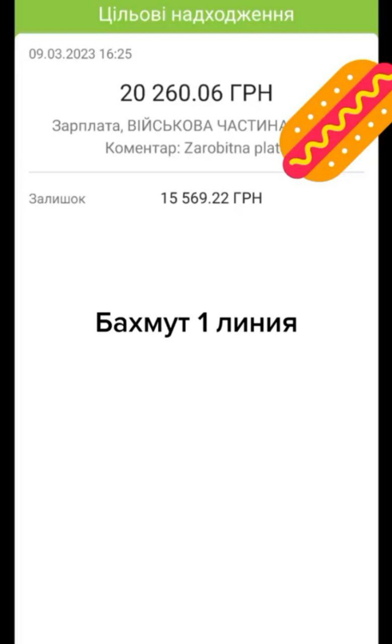 В соцсетях появились скриншоты выписок о поступлении средств на счёт военнослужащего. За бои под Артёмовском (Бахмут), где сейчас идут самые кровопролитные сражения, солдат получил чуть более 20 тыс. гривен (40 тыс. рублей).