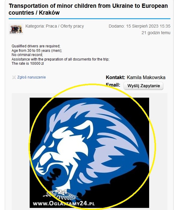На польском бесплатном сайте объявлений oglaszamy24 появилась вакансия, в которой разыскивают людей для вывоза детей с территории Украины. При изучении объявления оказалось, что его разместил известный в даркнете маркетплейс Lion market, продающий наркотики, фейковые личности, документы и услуги хакеров.