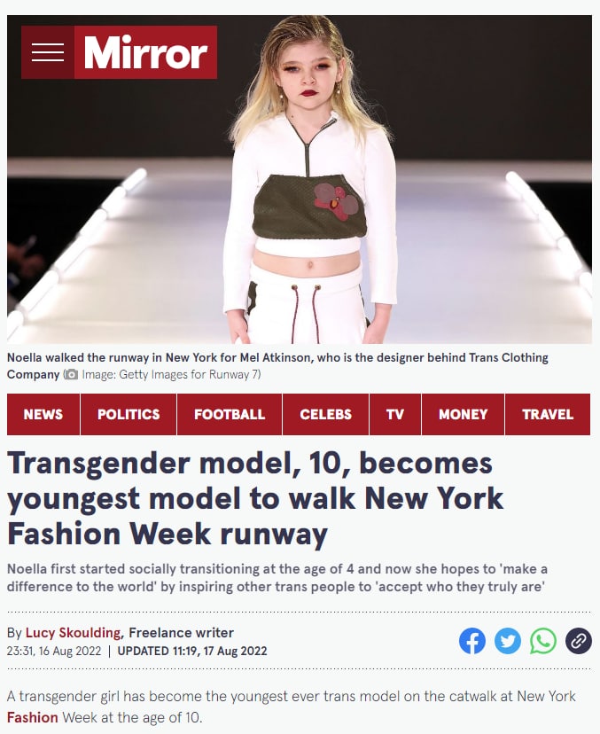 В Нью-Йорке (а где-же ещё?!) десятилетний Ноэла Макмахер, в образе девочки, продемонстрировал коллекцию бренда одежды Trans Clothing Company дизайнера Мела Аткинсона, предназначенную специально для транс-людей или, проще говоря, для людей с психическими отклонениями.