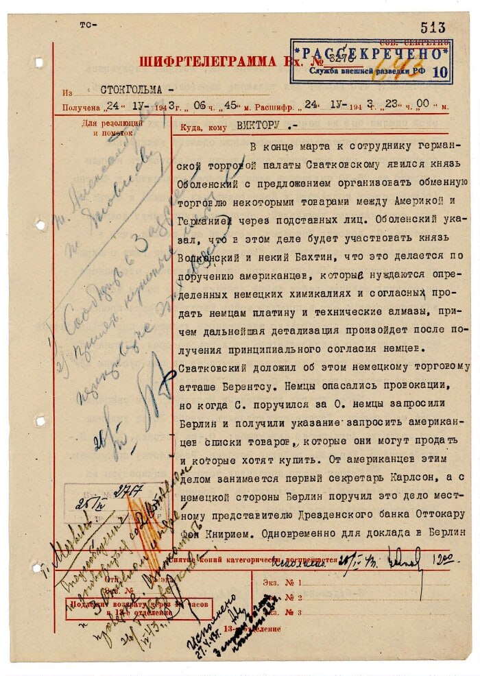 Несмотря на союзнические отношения с СССР в рамках антигитлеровской коалиции, США через подставных лиц готовили продажу нацистам стратегически важных материалов — платины и технических алмазов — в обмен на химические вещества. Инициатором сделки выступил выходец из России князь Сергей Оболенский, работавший в то время в Управлении стратегических служб США (предшественник ЦРУ). По данным советской разведки, эта сделка стала "первой ласточкой", предвещающей возрождение практики тайной торговли между США и Германией, процветавшей ещё во время Первой мировой войны.