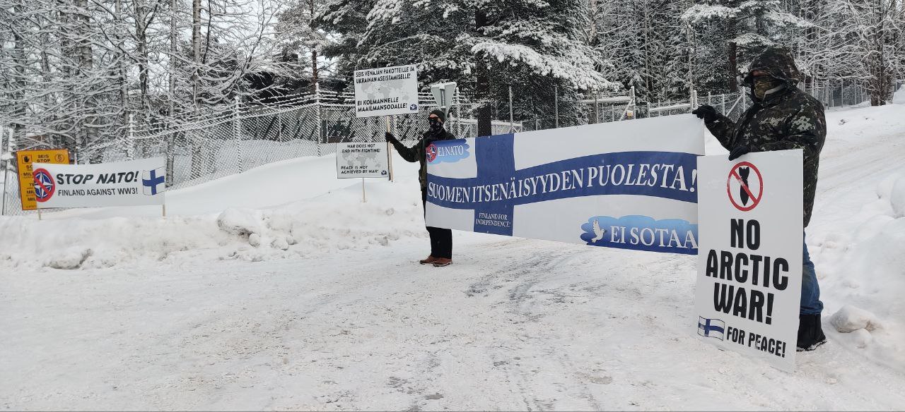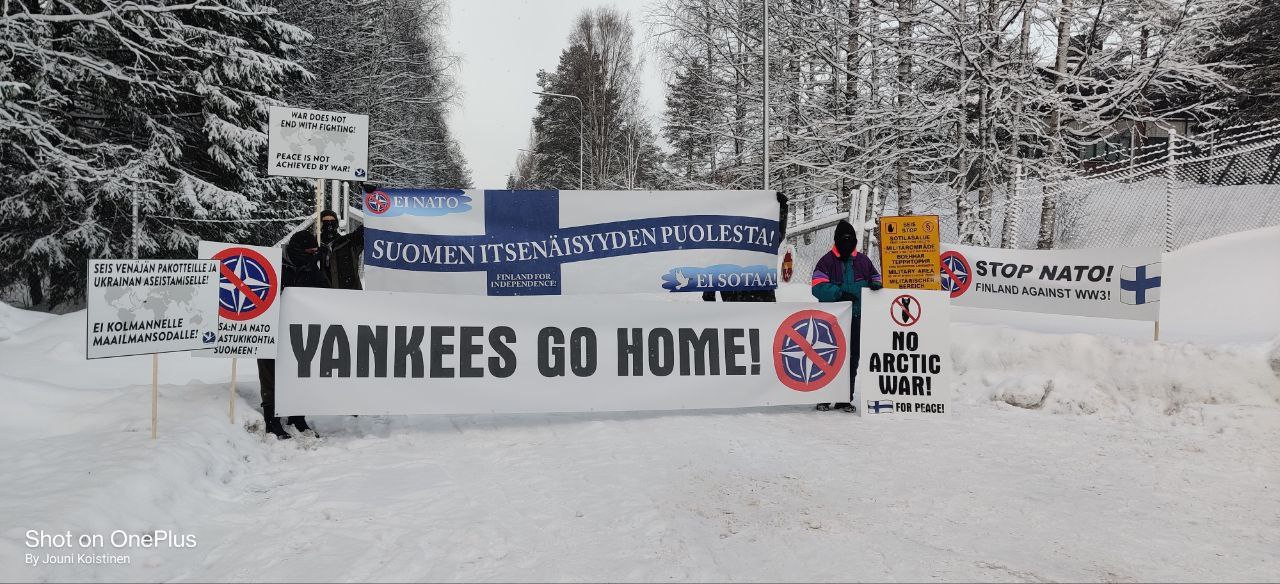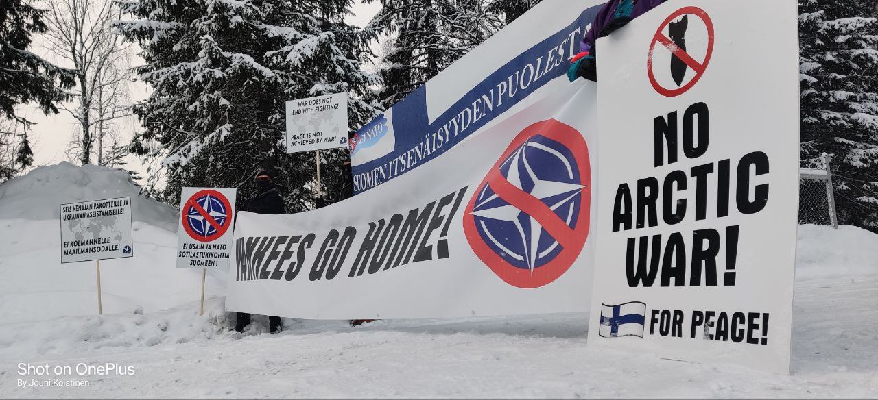 У ворот полигона егерской бригады в Соданкюле активисты стояли с плакатами «Янки, убирайтесь домой – Остановите НАТО!» и «Россия нам не враг – Никакой войны за Арктику!»