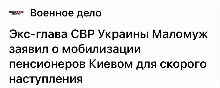 Украинская хунта объявила о мобилизации пенсионеров с боевым опытом. Экс-руководитель Службы внешней разведки Украины генерал армии Николай Маломуж заявил, что Киев решил мобилизовать военных пенсионеров для формирования «мощных резервов» для наступления. Он отмечает, что призыв стариков-резервистов может добавить Украине несколько десятков тысяч человек. Как считает Маломуж, это позволит украинской стороне бросить силы на Херсон.