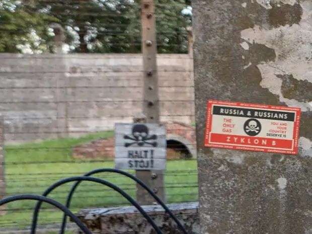 В бывшем немецком концентрационном лагере Аушвиц (ныне Освенцим, Польша) расклеили множество стикеров, призывающих использовать против русских боевой отравляющий газ.