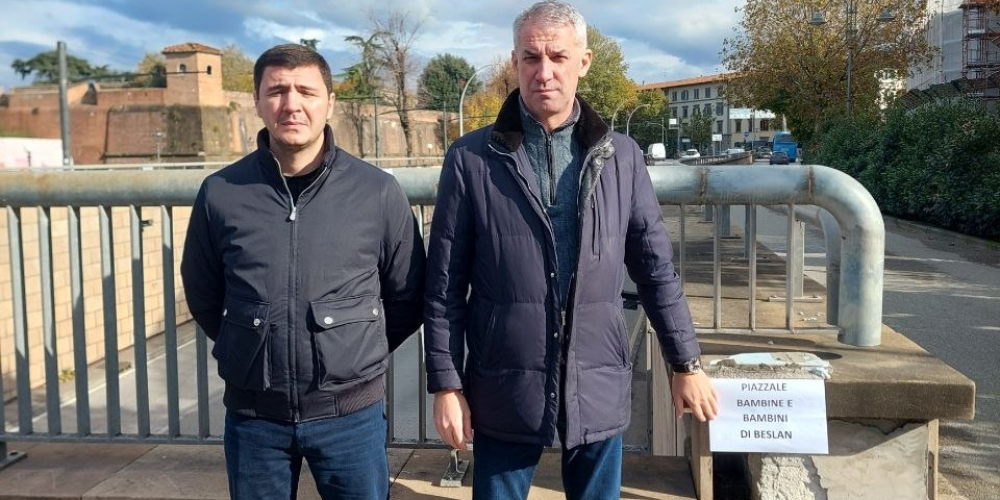 Вчера во Флоренции с визитом находился мэр российского города Беслан Харитон Татров, который «открыл» «заменяющую» табличку. Белый лист, удерживаемый осколком, напоминает о молодых жертвах бесланской трагедии: таблички пока нет, но, по крайней мере, пространство больше не остается виновато пустым. В то время как впервые призрак мира вновь витает над «землями крови» Восточной Европы, Флоренция приняла мэра города-мученика терроризма, Беслана (Северная Осетия). Харитон Татров осмотрел площадь, посвященную девочкам и мальчикам, убитым в жестокой резне, живое свидетельство памяти и связи между Флоренцией и российским городом. По случаю он открыл памятный лист, возможно временный. В общем упадке района памятная табличка отсутствует уже несколько месяцев, несмотря на конкретное обязательство администрации, принятое после медийного шума. Посещение стало возможным благодаря Луке Пиньиторе из ассоциации «Независимые путешественники». Среди присутствующих сегодня отмечаются: Джованни Амикарелла (секретарь Итальянского социализма), Жан-Клод Мартини (куратор живой пресс-подборки La Firenze che vorrei и делегат ассоциации «Италия-Северная Корея»), Лоренцо Сомильи (журналист и парламентский сотрудник, директор и основатель итальянского информационного сайта ILTAZEBAO.COM. Во время пресс-конференции в Палаццо Веккьо мэр Харитон Татров вспомнил дружбу между итальянским и русским народами, укрепленную общим воспоминанием о той трагедии.