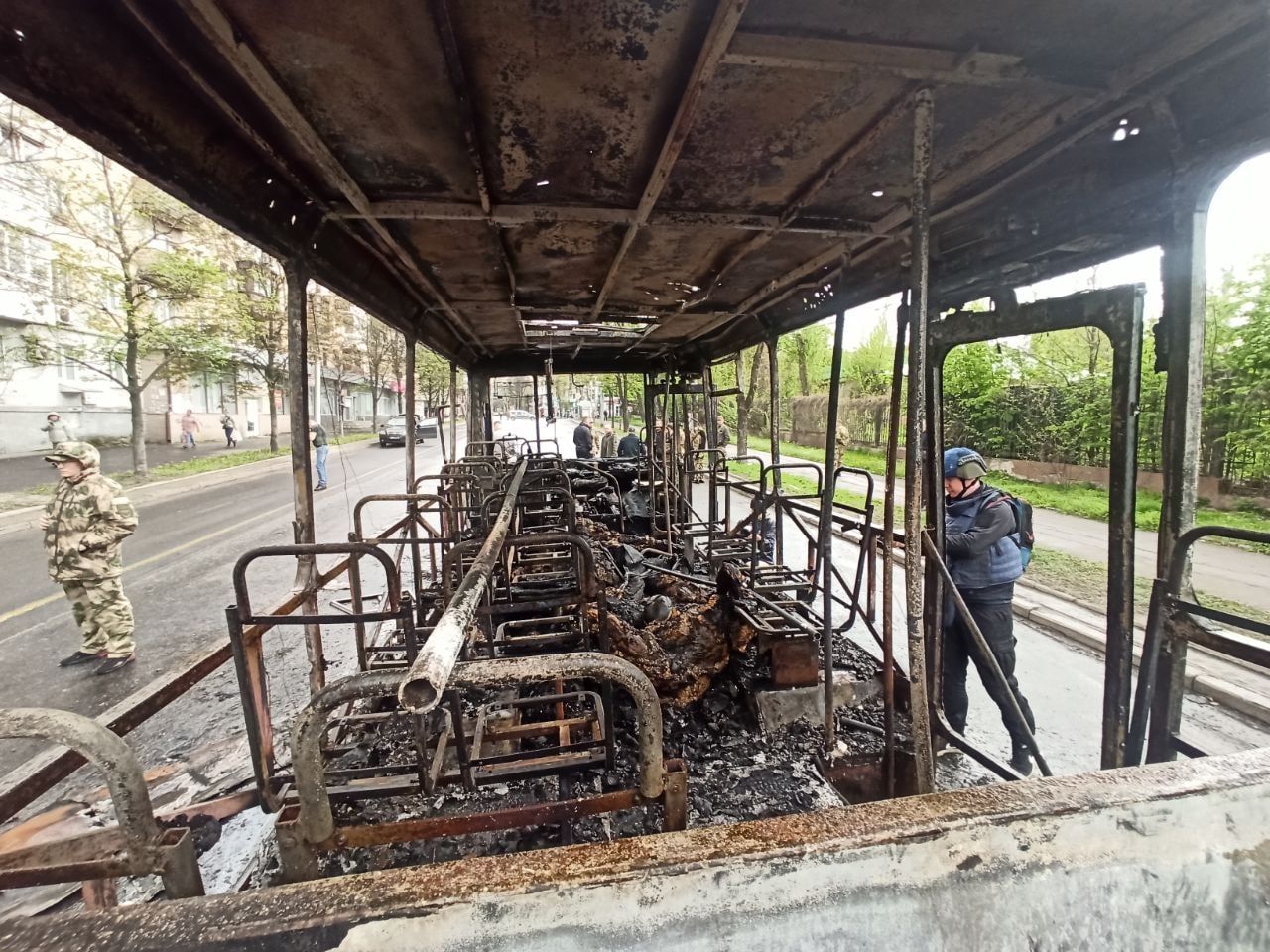 Автобус следовал по улице Университетская по маршруту № 25, когда по нему ударили ВСУ. Транспортное средство загорелось, находящиеся в салоне люди погибли.