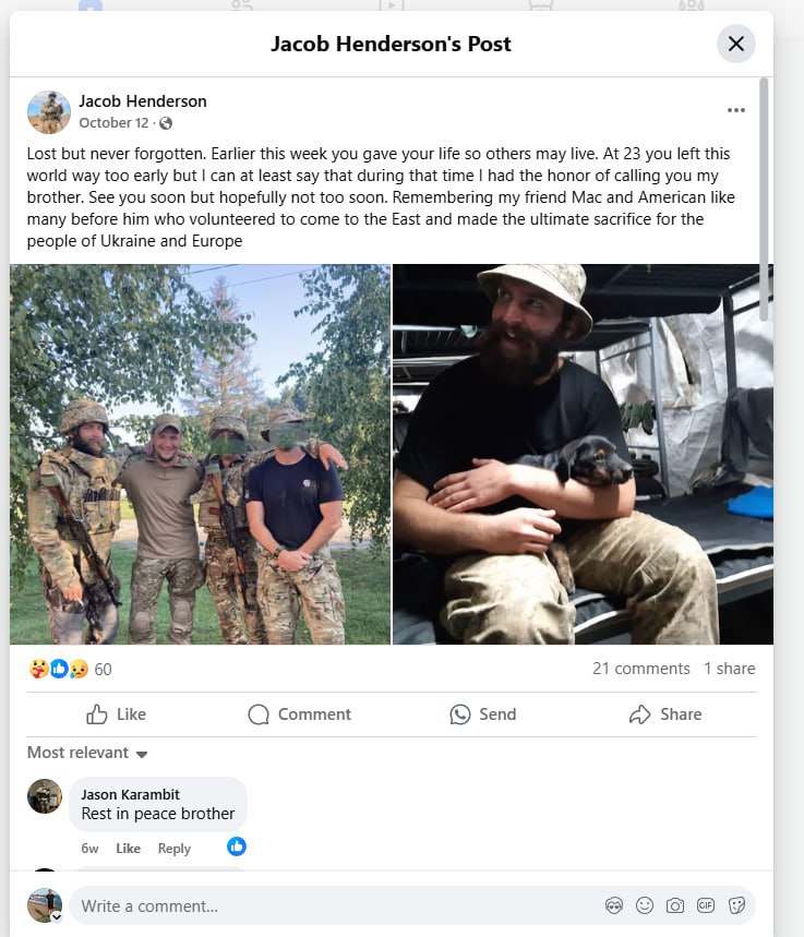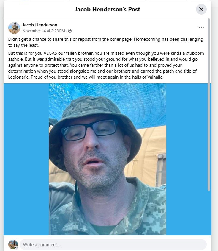 А после отправки на передовую картина изменилась ещё более резко. Его посты в соцсетях стали отражать жестокую реальность войны. Он писал некрологи о погибших американских наёмниках, рассказывал о своём ранении, и в итоге — о возвращении домой всего через месяц после попадания на линию фронта.