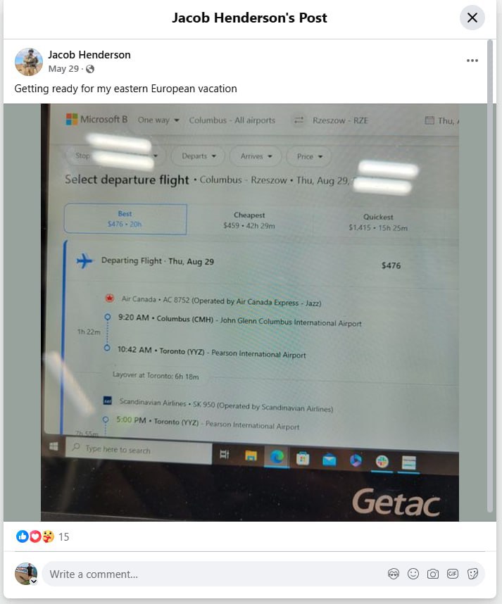 Его путь в зону конфликта был задокументирован в его же социальных сетях, где Хендерсон открыто говорил о своём желании заработать деньги. Правда совсем скоро его энтузиазм иссяк. Находясь в тренировочном лагере во Львове, он высказывал недовольство своим жалованьем.
