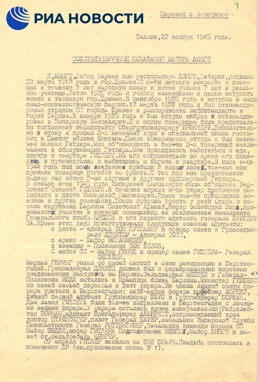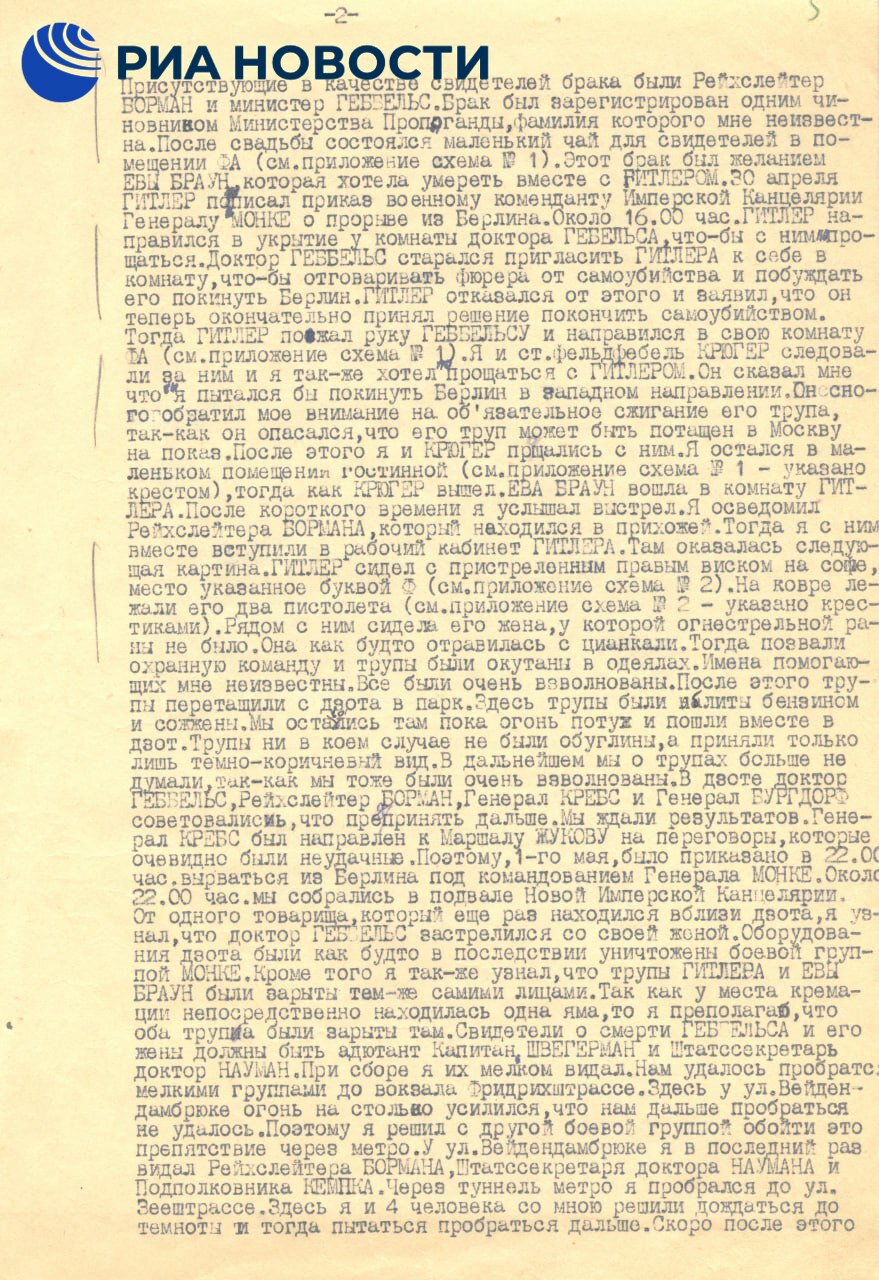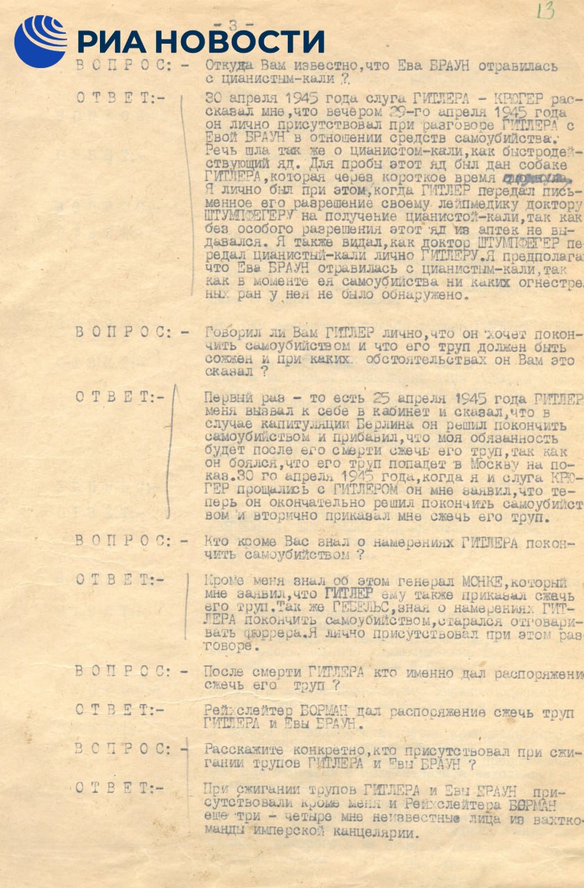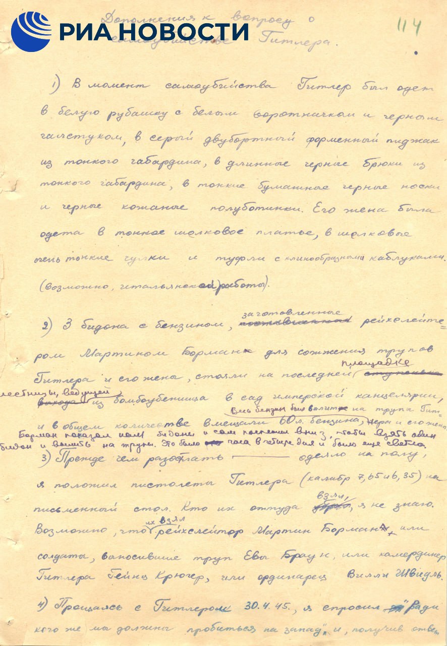ФСБ опубликовала новые рассекреченные архивные документы, посвящённые самоубийству Адольфа Гитлера 80 лет назад в Берлине, окруженном советскими войсками. В документах содержатся дополнительные подробности о событиях, происходивших в бункере Гитлера до и после его смерти.