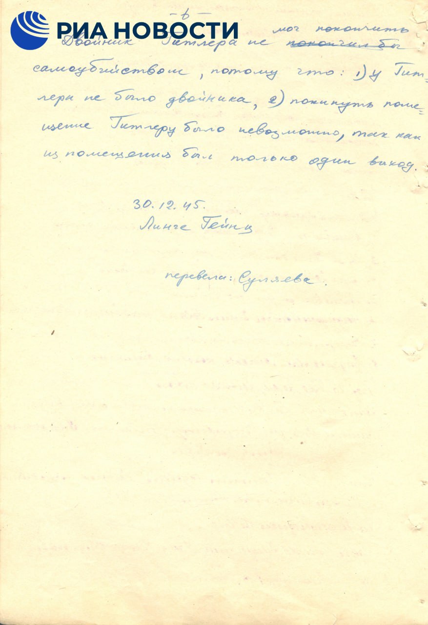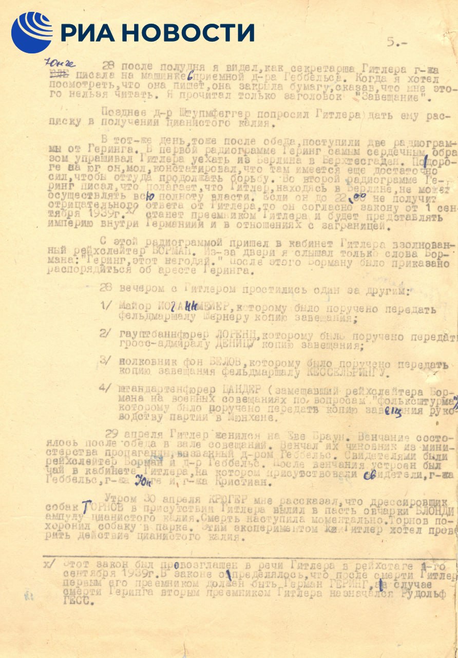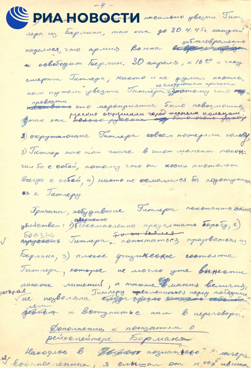 ФСБ опубликовала новые рассекреченные архивные документы, посвящённые самоубийству Адольфа Гитлера 80 лет назад в Берлине, окруженном советскими войсками. В документах содержатся дополнительные подробности о событиях, происходивших в бункере Гитлера до и после его смерти.