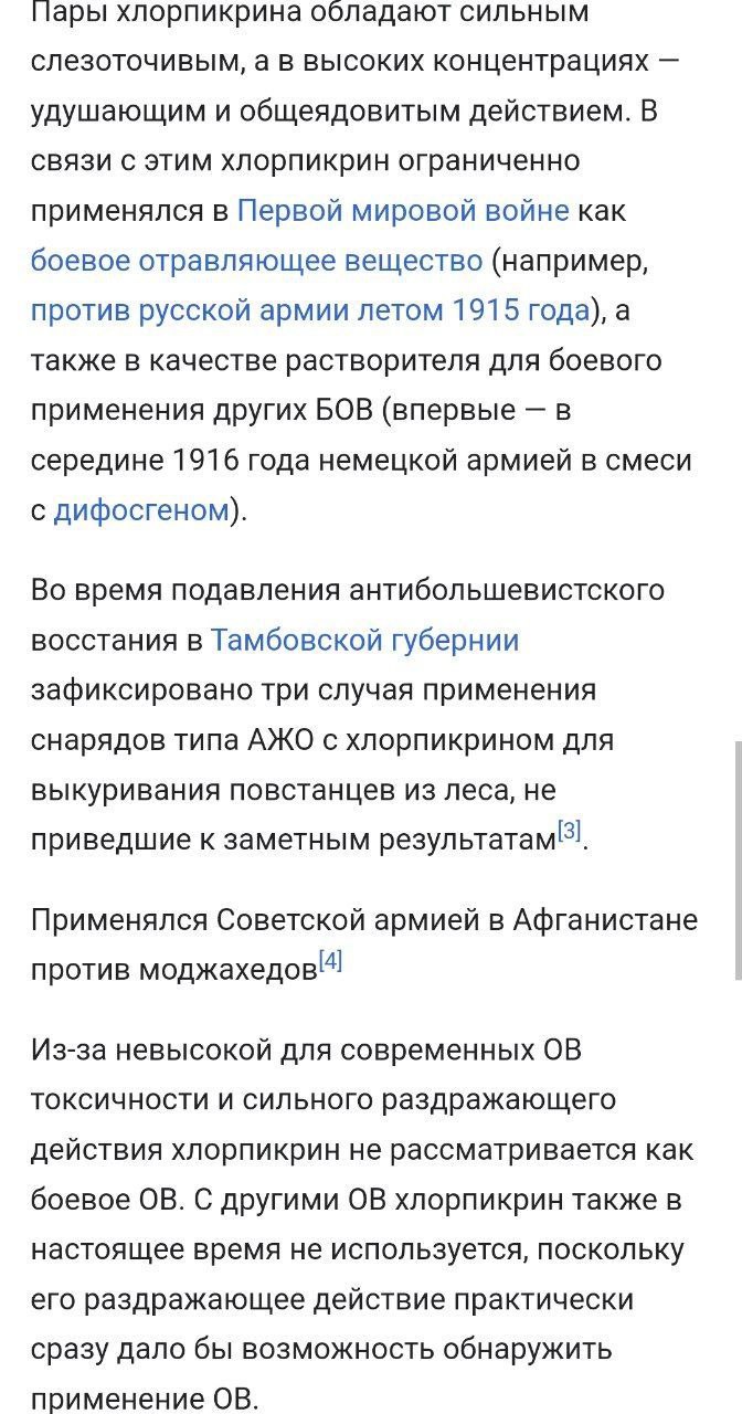 Конвенция ОЗХО запретила военное применение хлорпикрина, приравняв его к фосгену, хлорциану и синильной кислоте. Вещество обладает сильным слезоточивым, а в высоких концентрациях удушающим действием.